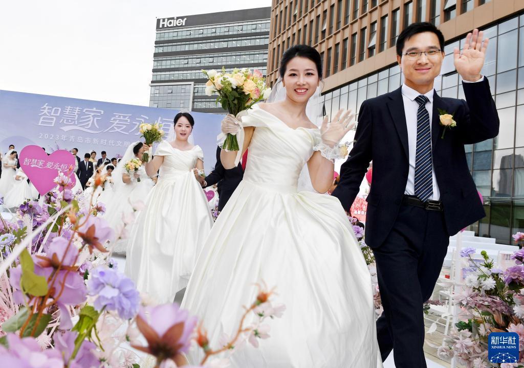 6月10日,新人們在青島市嶗山區海爾科創生態園新時代文明實踐廣場參加集體婚禮。
