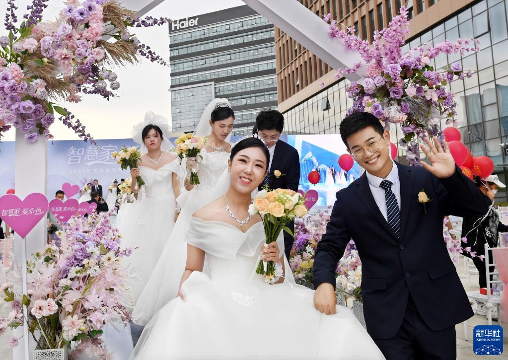 6月10日,新人們在青島市嶗山區海爾科創生態園新時代文明實踐廣場參加集體婚禮。