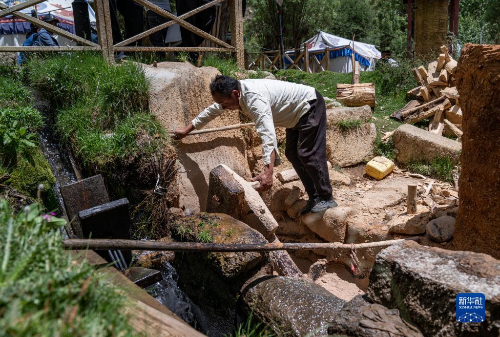 在西藏尼木縣吞巴鎮吞達村,次仁多吉在啟動水磨,將作為原料的柏木碾成木漿(6月9日攝)。