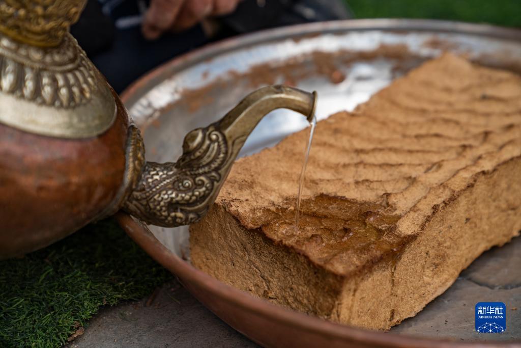在西藏尼木縣吞巴鎮吞達村,次仁多吉用水浸潤晾曬后的香磚(6月9日攝)。