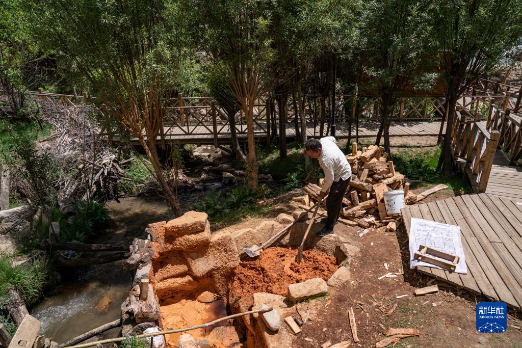 在西藏尼木縣吞巴鎮吞達村,次仁多吉將柏木漿制作成香磚(6月9日攝)。