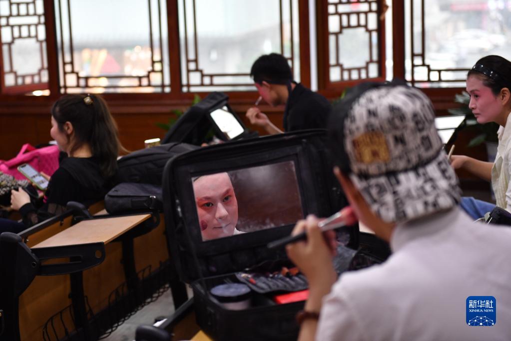 6月5日,在長沙市坡子街火宮殿,長沙市花鼓戲保護傳承中心的演員在演出前化妝。