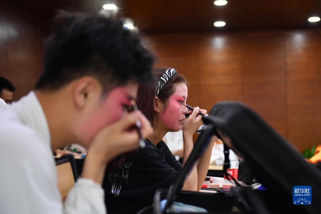 6月5日,在長沙市坡子街火宮殿,長沙市花鼓戲保護傳承中心的演員在演出前化妝。