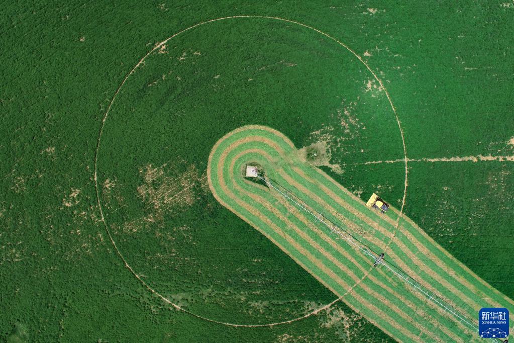 6月10日,牧草收割機在鄂托克前旗昂素鎮收獲紫花苜蓿(無人機照片)。