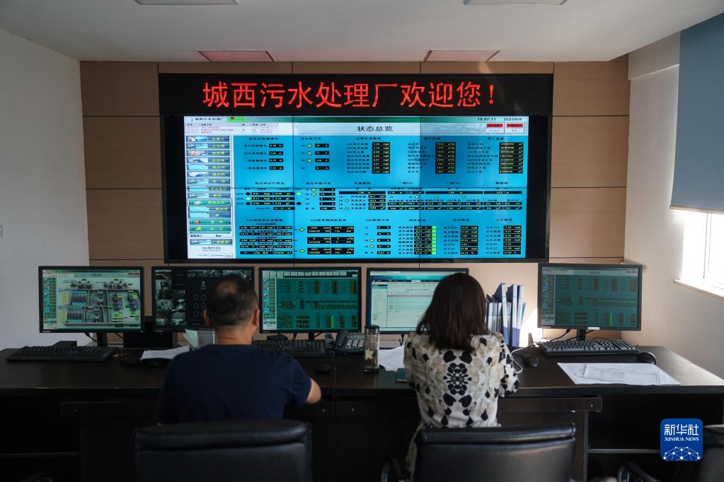 6月9日,工作人員在監控污水處理廠運行情況。