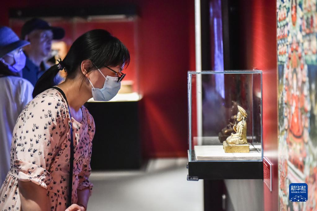 6月10日,2023“文化和自然遺產日”北京市主場活動暨北京白塔文化周開幕。觀眾在觀看“吉祥妙塔 寶藏重光——白塔塔藏文物展”中展出的文物。