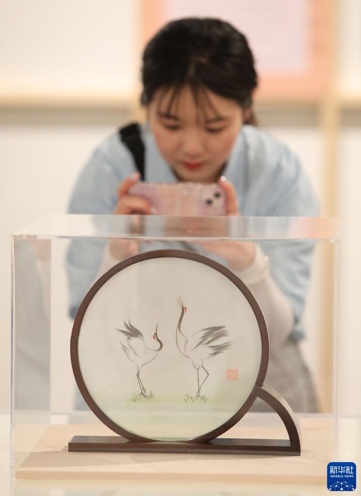 6月10日,一名市民在江蘇蘇州美術館用手機拍攝展出的非遺刺繡作品。