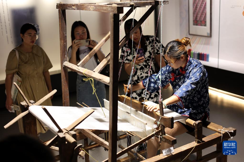 6月10日,在山東省濱州市博物館,非遺傳承人向參觀者展示傳統織布技藝。