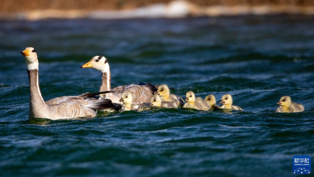 6月6日,在甘肅阿克塞哈薩克族自治縣境內的小蘇干湖濕地,斑頭雁帶領雁寶寶在水中活動。
