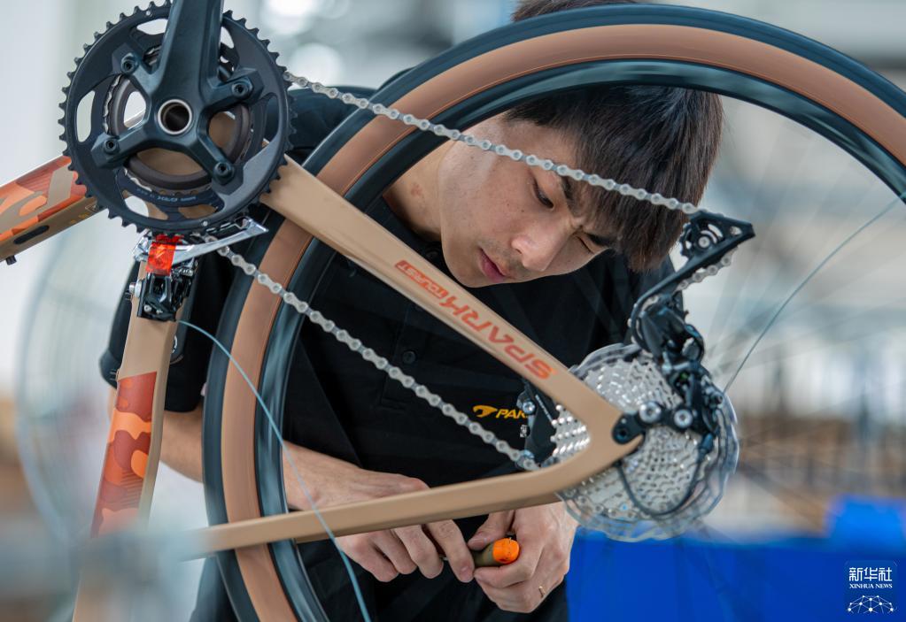 6月2日,在山東省樂陵市泰山瑞豹復合材料有限公司的碳纖維自行車生產車間,工人在裝配作業。
