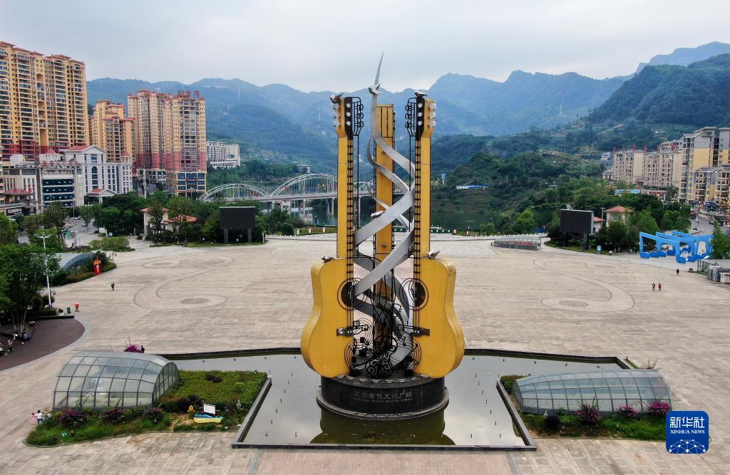 正安吉他廣場上豎立著大型的吉他雕塑(6月7日攝)。