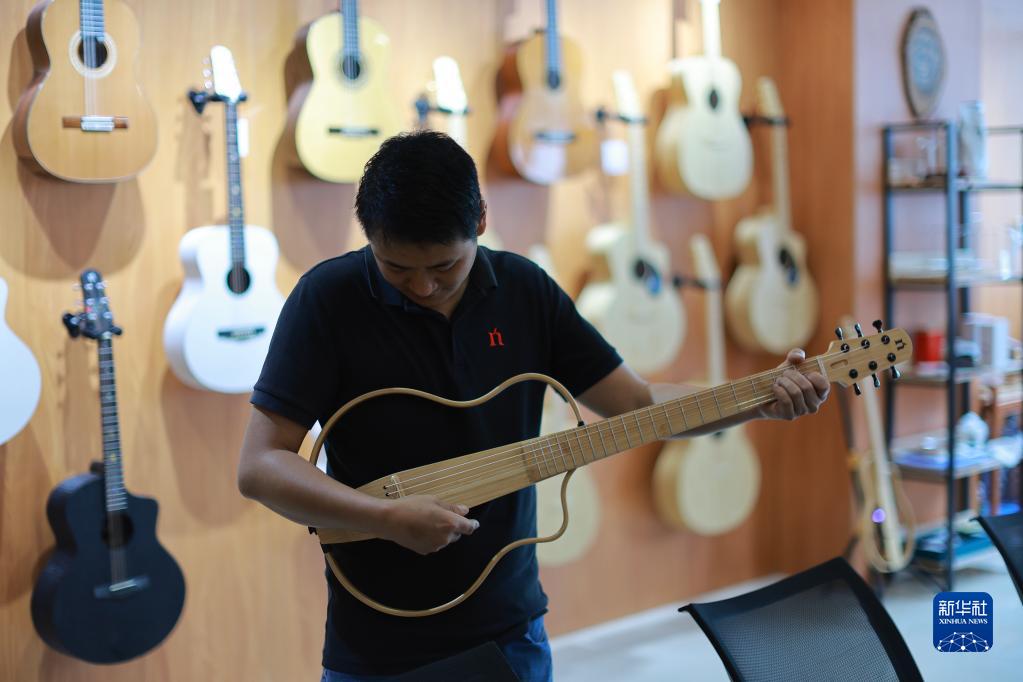工作人員在正安吉他產業園內試彈一種新型吉他(6月7日攝)。