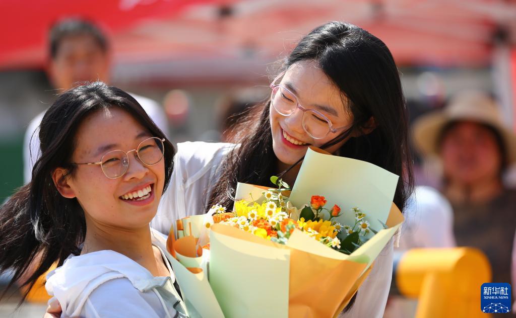 6月10日,在山東省滕州市第二中學考點,一名考生(左)從朋友手中接過鮮花。