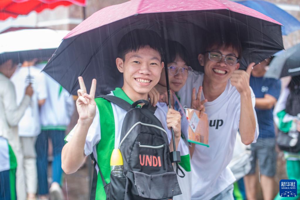 6月10日,海南省瓊海市的考生冒雨走出考點。