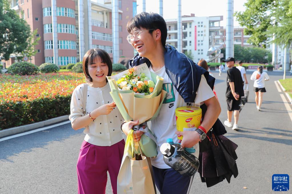 6月10日,在浙江省湖州市德清縣第一中學考點,家長給考生送上鮮花。