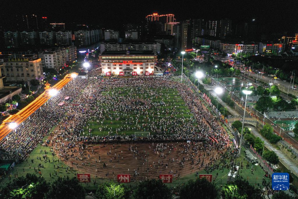 6月10日,演員在貴州“村超”足球比賽后表演民族舞蹈“多耶”,現場觀眾一起上場狂歡(無人機照片)。