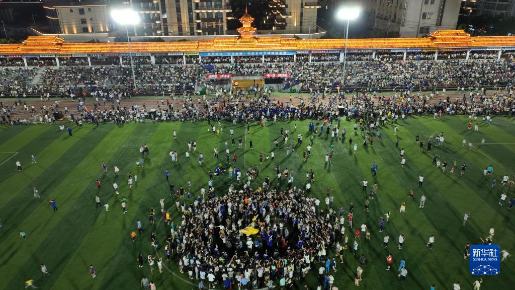 6月9日拍攝的貴州“村超”足球比賽休息期間的民族舞蹈表演(無人機照片)。