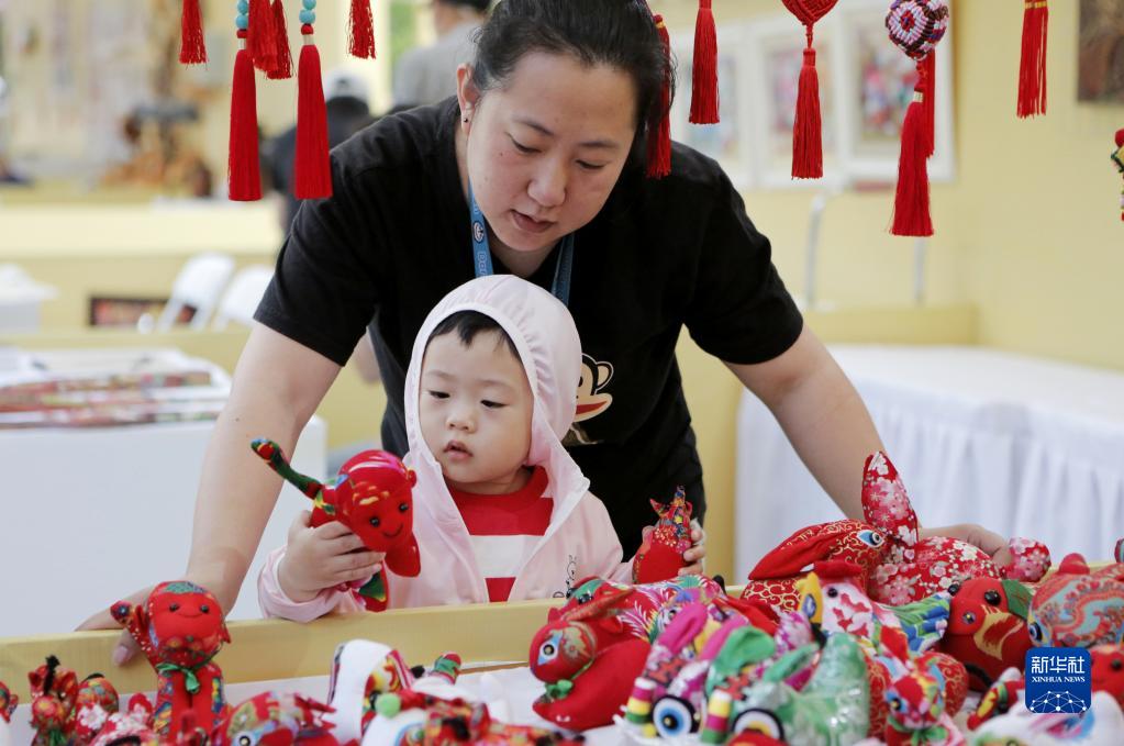 6月10日,在哈爾濱市索菲亞廣場非遺工坊展,市民在了解傳統手工布藝展品。