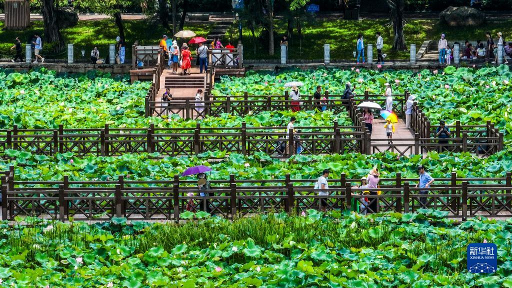 6月10日,游人在南寧市南湖之濱荷花池參觀游覽(無人機照片)。