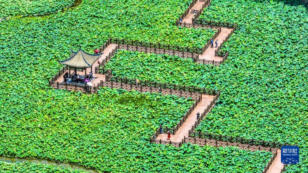 6月10日,游人在南寧市南湖之濱荷花池參觀游覽(無人機照片)。