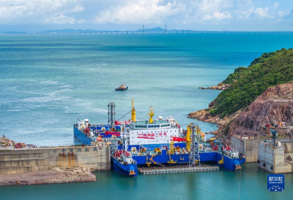 “一航津安1”號沉管運輸安裝一體船拖帶E23管節和最終接頭從珠海桂山島啟航,前往沉放水域(6月8日攝,無人機照片)。