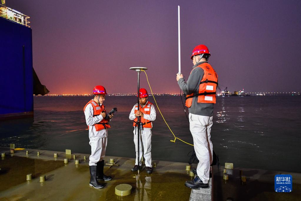 鎖旭宏(左)帶領團隊在“一航津安1”號沉管運輸安裝一體船搭載的E16沉管上檢查北斗衛星定位精準測量(2022年1月14日攝)。