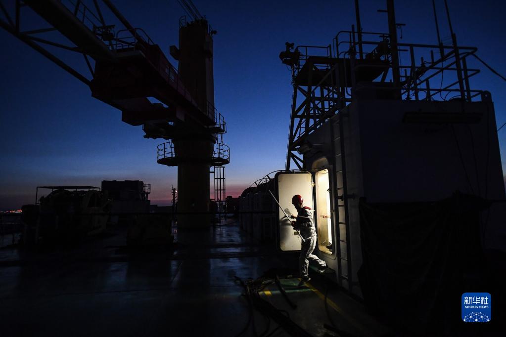 鎖旭宏從“一航津安1”號沉管運輸安裝一體船前甲板設備房取出設備準備工作(2022年7月22日攝)。