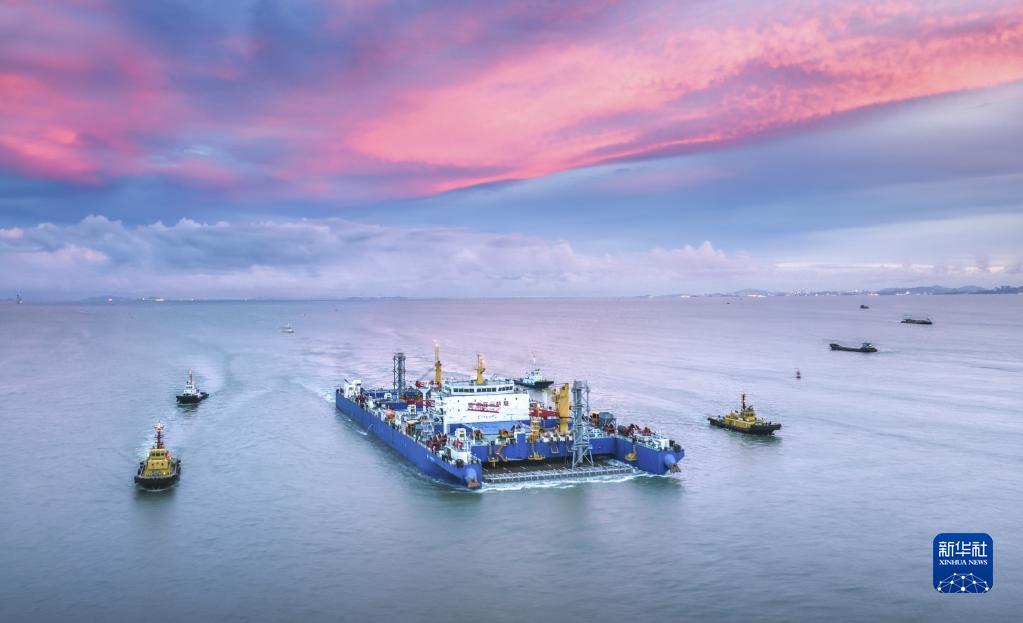 “一航津安1”號沉管運輸安裝一體船將E23管節和最終接頭浮運至安裝現場(無人機照片,2023年6月8日攝)。
