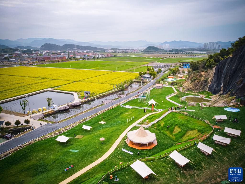 這是3月29日拍攝的浙江諸暨市楓橋鎮杜黃新村用廢棄礦山改造的露營旅游地(無人機照片)。