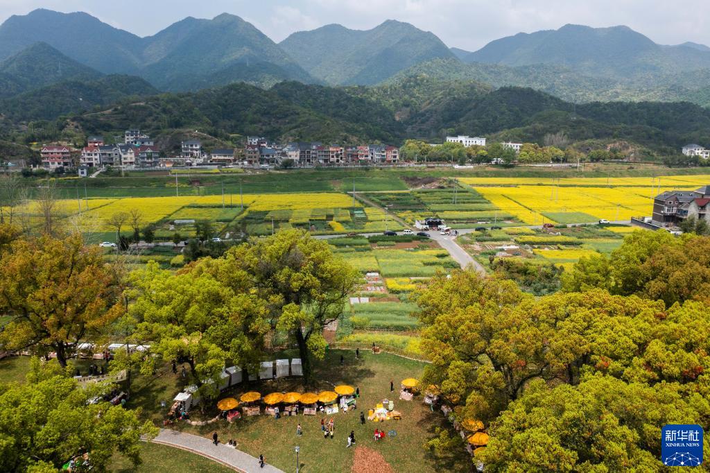 空中俯瞰浙江杭州市富陽區新桐鄉小桐洲村香樟公園和盛開的油菜花田(4月7日攝,無人機照片)。新桐鄉依托近萬畝盛開的油菜花田和美麗的富春江風景,開展特色鄉村文旅活動,做好美麗鄉村、美麗經濟的文章,助力鄉村振興。