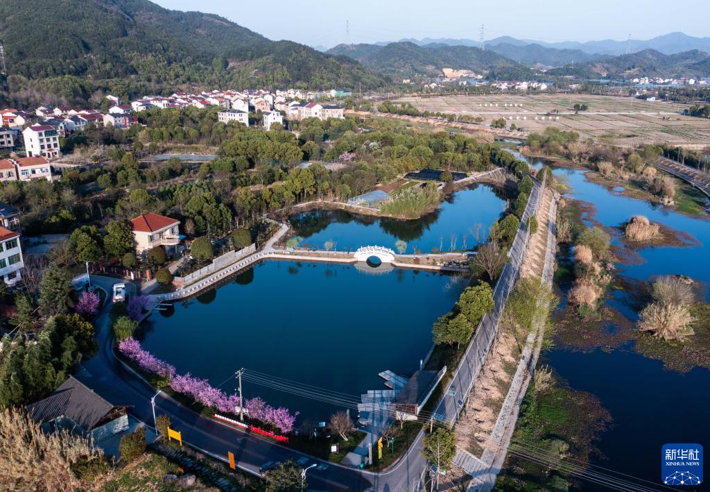 空中俯瞰浙江金華市金東區嶺下鎮八仙溪及周邊村莊(3月14日攝,無人機照片)。近年來,嶺下鎮通過“抓源頭、強整治、做項目、重長效”的治理思路,先后關停八仙溪沿岸多家制砂企業及養殖場,清理河道垃圾,完成28個村農村生活污水處理工程和51口池塘清淤,2018年以來八仙溪水質常年保持在Ⅱ類以上。