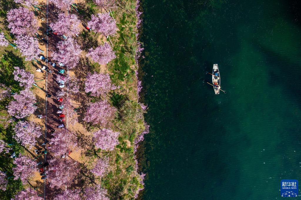 在浙江金華市浦江縣浦陽江同樂段,工作人員乘船在打撈水面漂浮物(3月14日攝,無人機照片)。當地通過生態治理、河湖清淤、景觀改造、種植水生植物等綜合整治措施,造就浦陽江畔春有櫻花落英、秋有杉葉火紅的四季美景,滿足群眾賞景及親水需求。浦陽江也成功創建為“浙江省美麗河湖”。