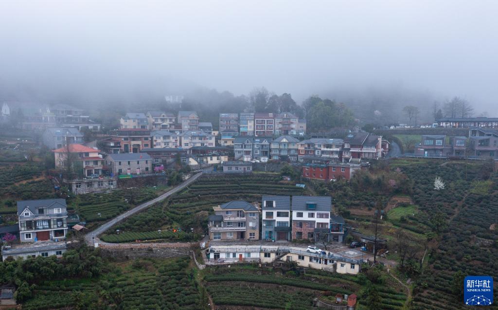 空中俯瞰云霧中的浙江杭州富陽里山鎮安頂村(3月23日攝,無人機照片)。安頂村海拔700多米,一年中有200多天可觀賞“安頂云?!逼婢?,當地百姓依托高山云霧茶以及特色鄉村旅游產業,走出了一條茶旅融合的新農村共同富裕發展模式。