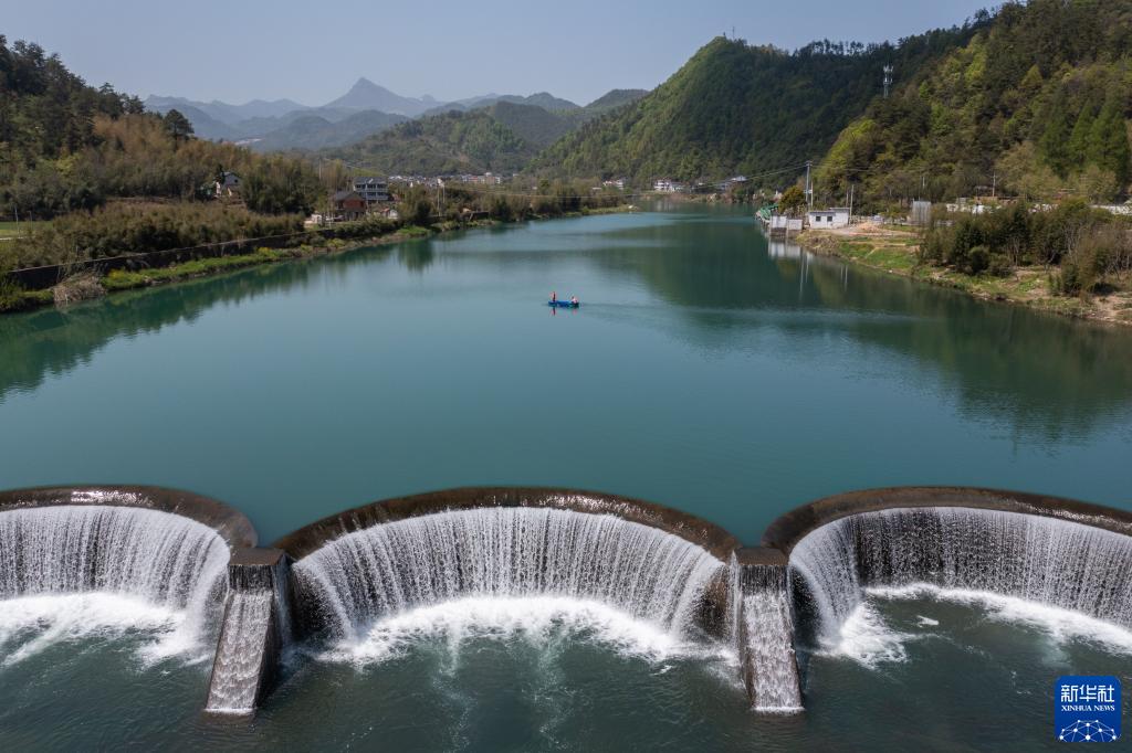 浙江杭州市臨安區昌化鎮黨員巡河護水志愿者乘船對昌化溪進行日常河道保潔及巡查(2022年4月7日攝)。