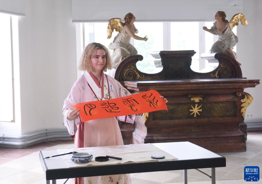 6月10日,在奧地利維也納大學,選手漢娜·熱姆利奇在才藝表演環節展示書法作品。
