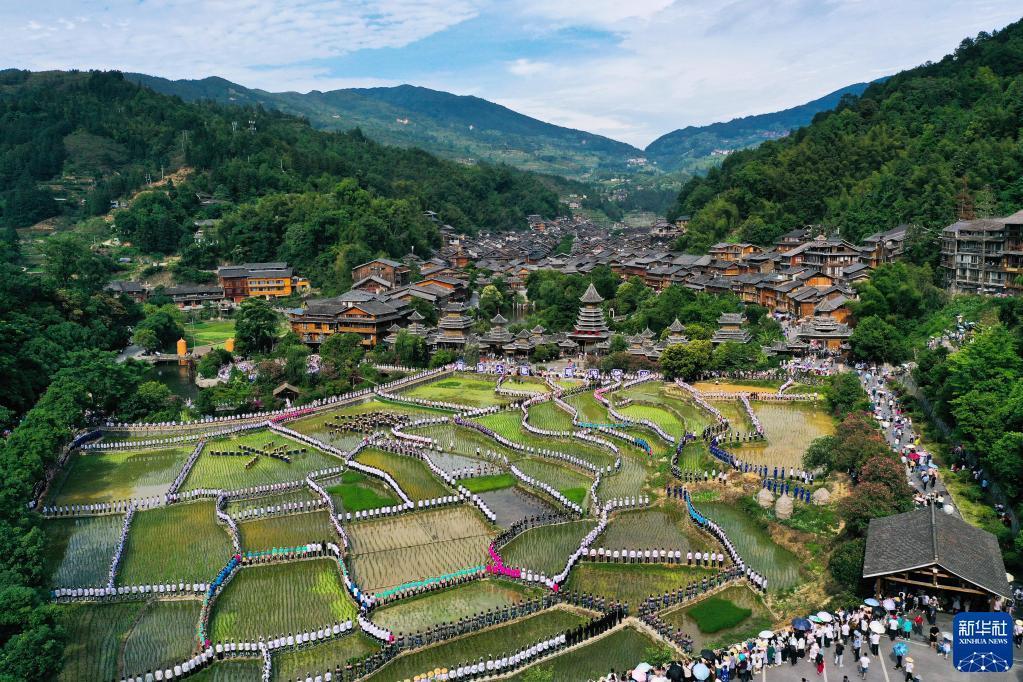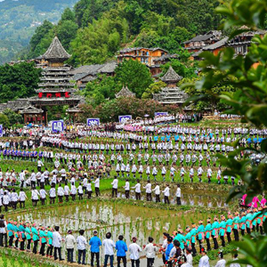 6月10日,在貴州省黔東南苗族侗族自治州黎平縣肇興侗寨,以侗寨作背景,以田園為舞臺,來自黔東南州各縣市的歌手與現場游客、群眾約萬人合唱侗族大歌等歌曲,展示人類非物質文化遺產之美。