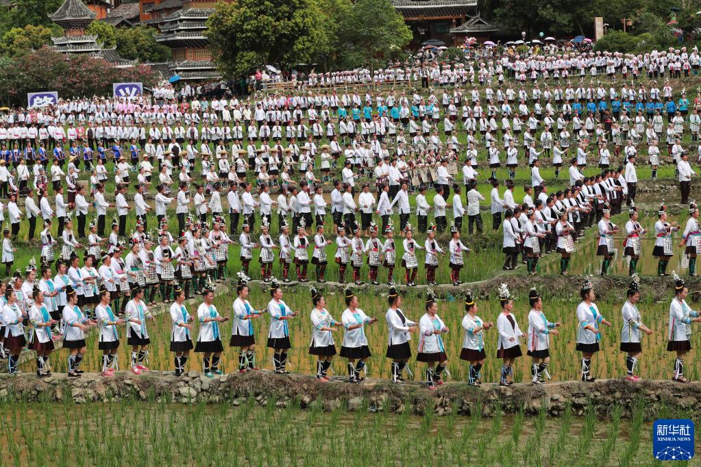6月10日,在貴州省黔東南苗族侗族自治州黎平縣肇興侗寨,以侗寨作背景,以田園為舞臺,來自黔東南州各縣市的歌手與現場游客、群眾約萬人合唱侗族大歌等歌曲,展示人類非物質文化遺產之美。