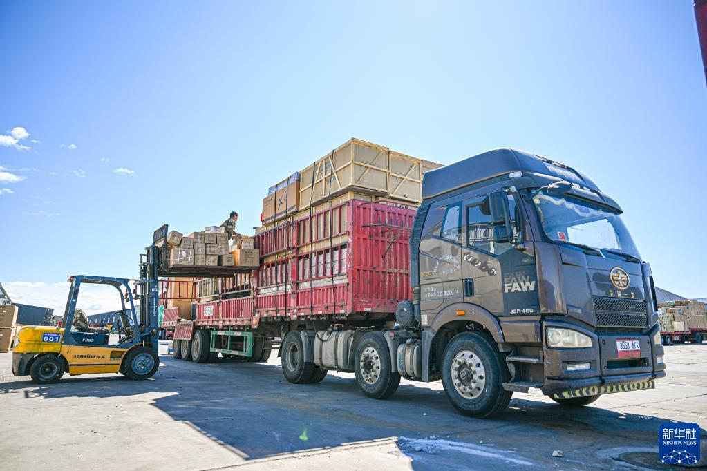 6月11日,工人在二連浩特口岸旁的進出口物流園區中裝載準備出口的貨物。