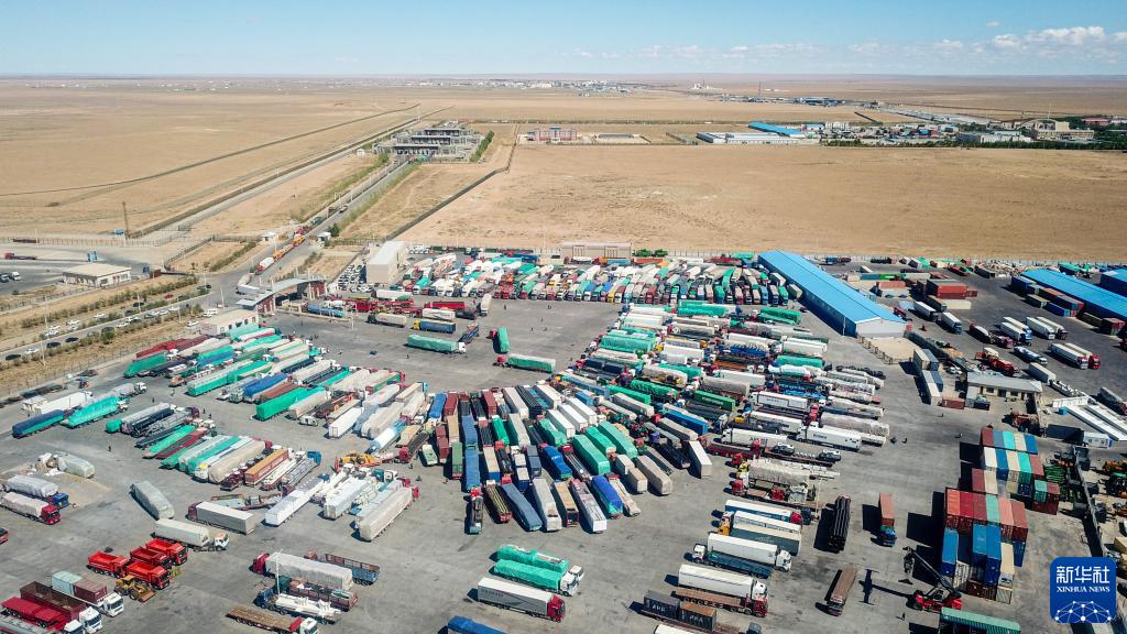 6月11日,二連浩特口岸旁的進出口物流園區中大量貨運卡車排隊準備出關(無人機照片)。