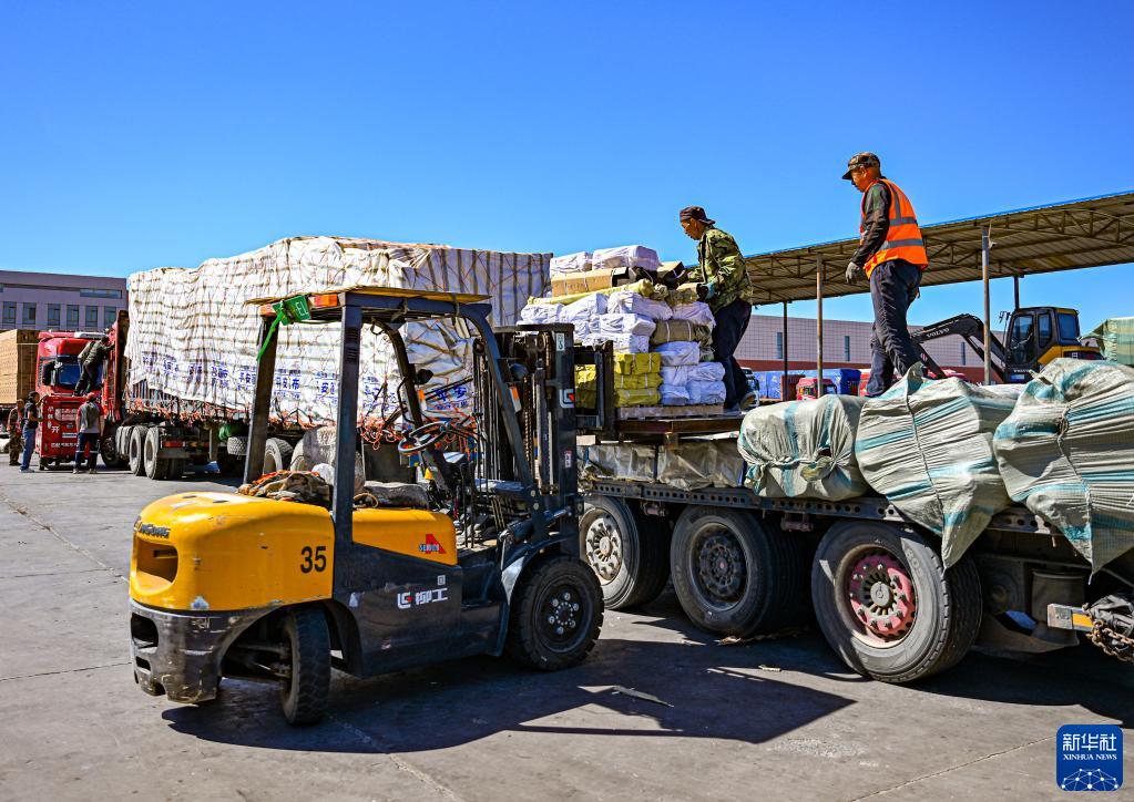 6月11日,工人在二連浩特口岸旁的進出口物流園區中裝載準備出口的貨物。
