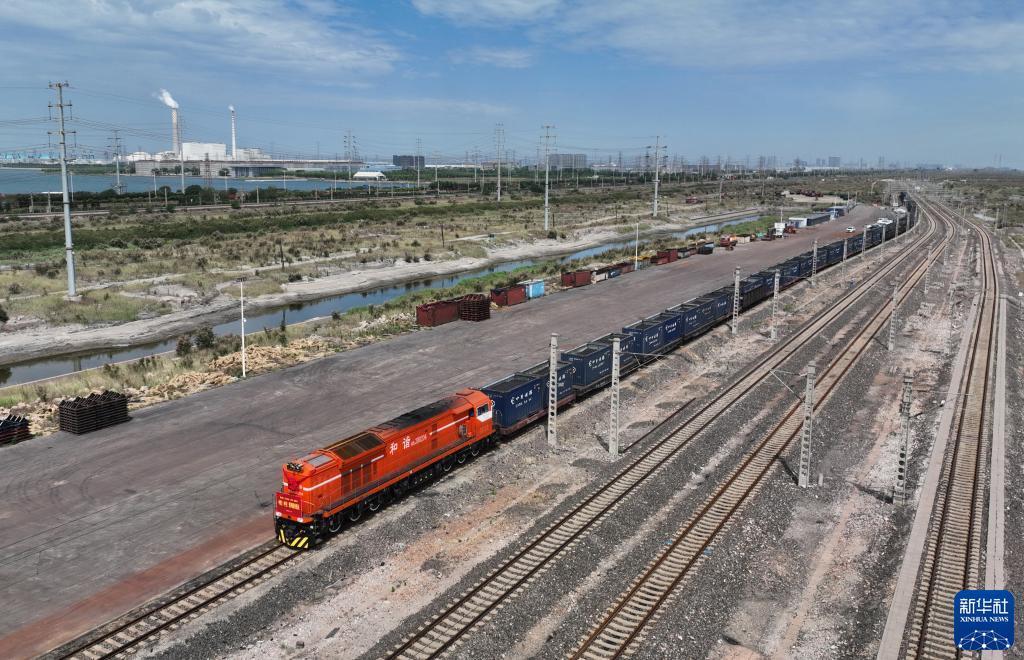 6月11日,由蒙古國烏蘭巴托開來的滿載3100噸煤炭的中歐(中亞)班列駛入中國鐵路北京局曹妃甸站(無人機照片)。