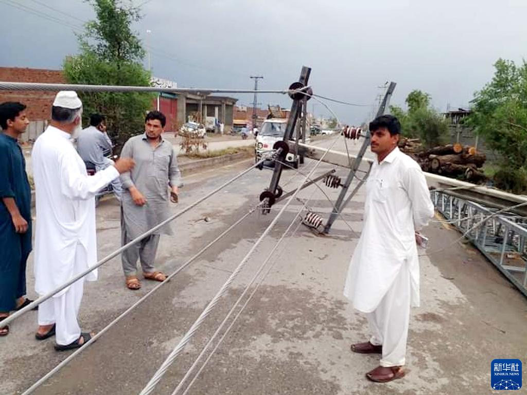 6月10日,在巴基斯坦本努地區,人們查看被暴雨損毀的電線桿(手機照片)。