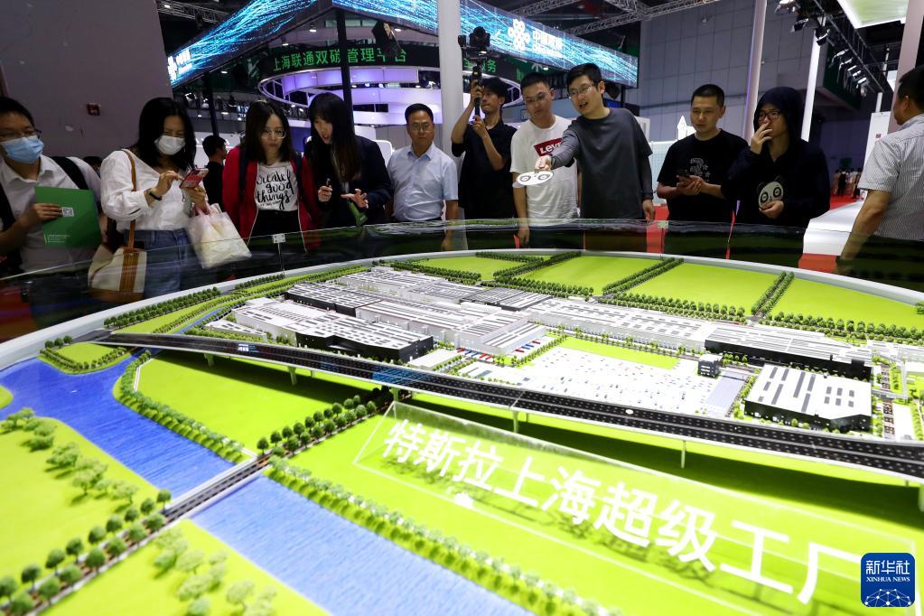 6月11日,參觀者在特斯拉上海超級工廠沙盤模型前交流討論。