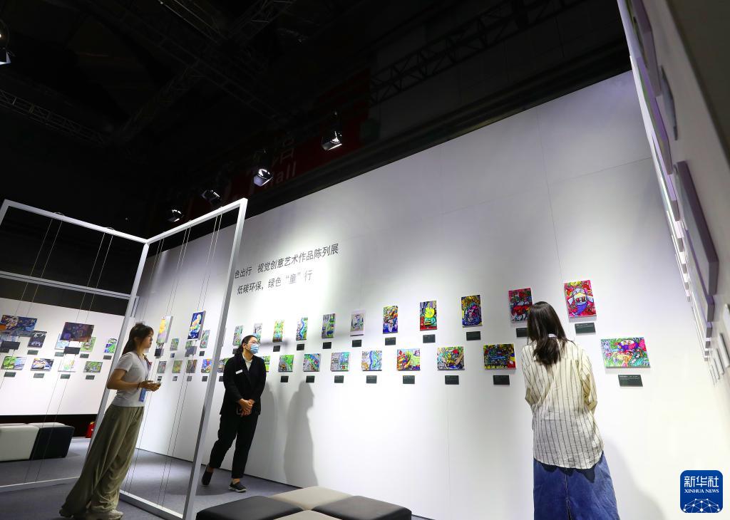 6月11日,參觀者在博覽會上一個低碳環保主題兒童繪畫作品展示區內駐足觀看。
