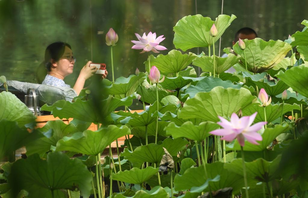 6月11日,游客在曲院風荷景區乘船欣賞荷花。