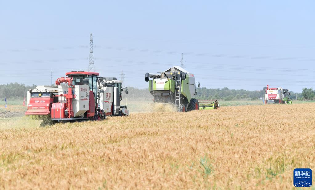 6月11日,在天津市靜海區蔡公莊鎮,農機在收割小麥。