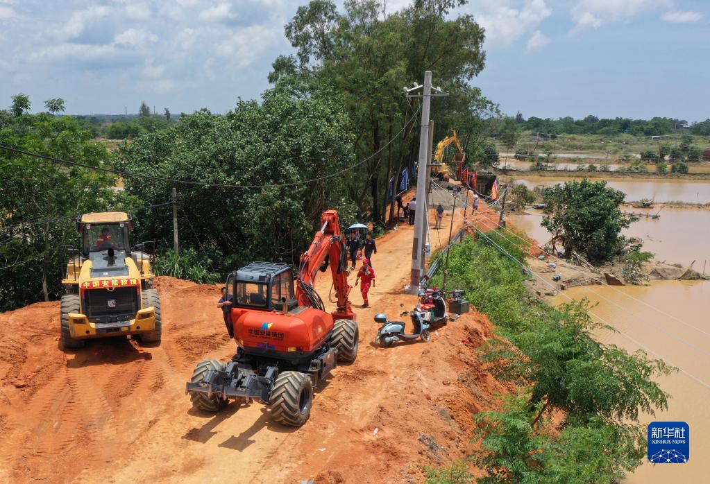 6月11日,在廣西合浦縣白沙鎮,工人在施工修復遭洪水損毀的堤壩(無人機照片)。