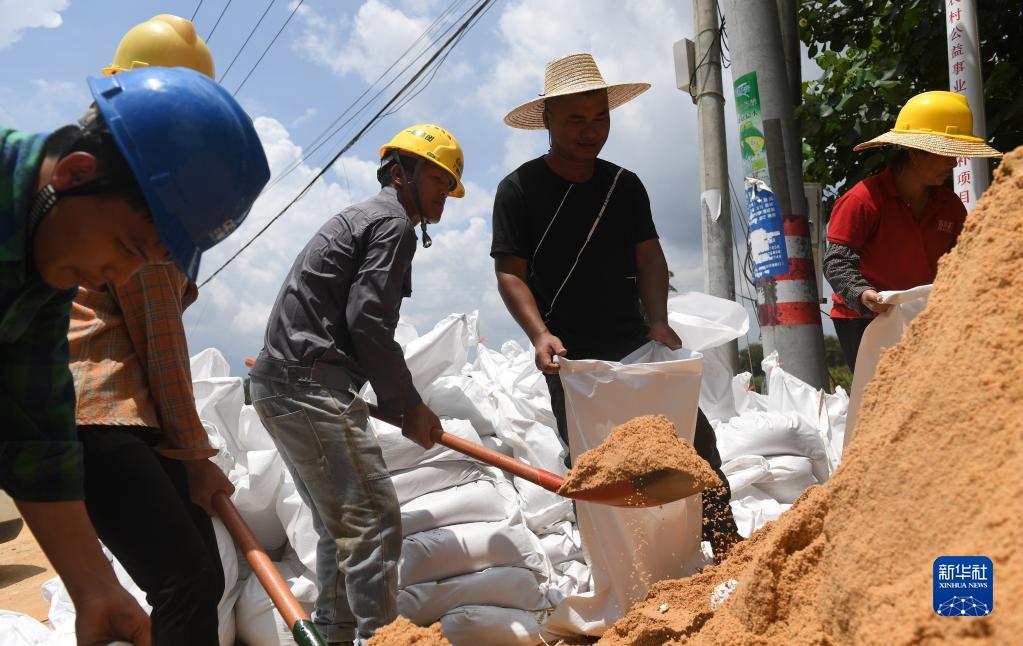 6月11日,在廣西合浦縣白沙鎮,人們在裝沙子準備修復遭洪水損毀的堤壩。