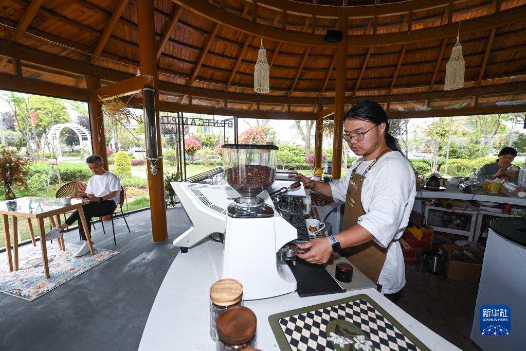 工作人員在浙江湖州織里鎮伍浦村漁耕文化園的陶灣里鄉村咖啡店工作(4月11日攝)。近年來,織里鎮依托當地美麗鄉村建設以及自然風光,招引鄉賢返鄉創業,依托閑置民宅、閑置土地建設特色咖啡店、花海景觀、特色民宿和農家樂等,發展鄉村旅游經濟。