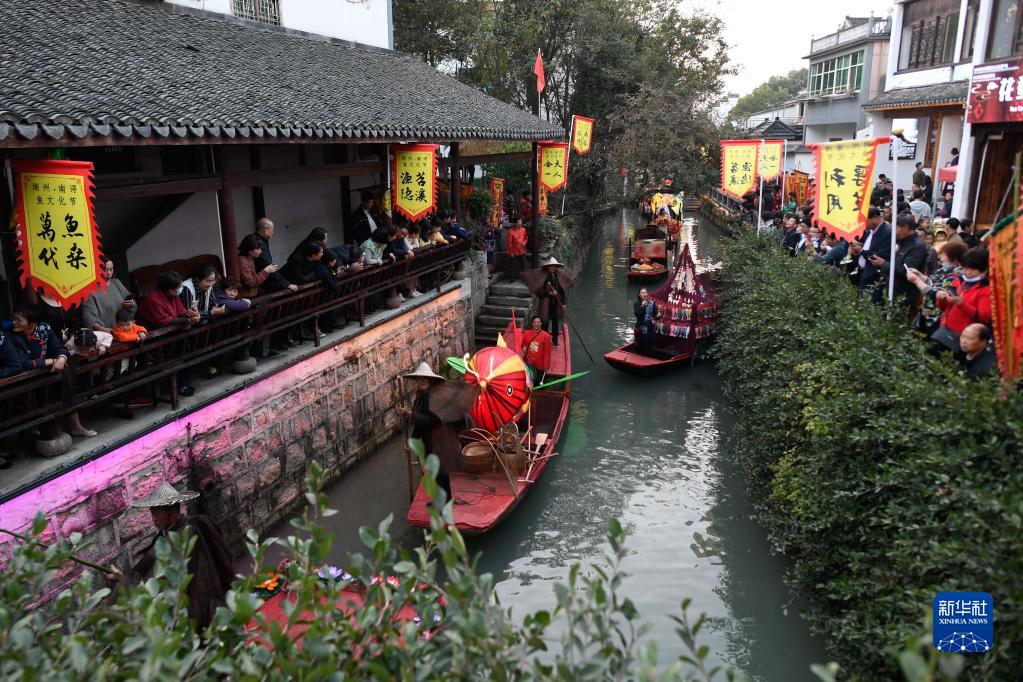 游客在浙江湖州南潯區和孚鎮荻港村觀看“水上曬秋”豐收慶典(2020年11月15日攝)。